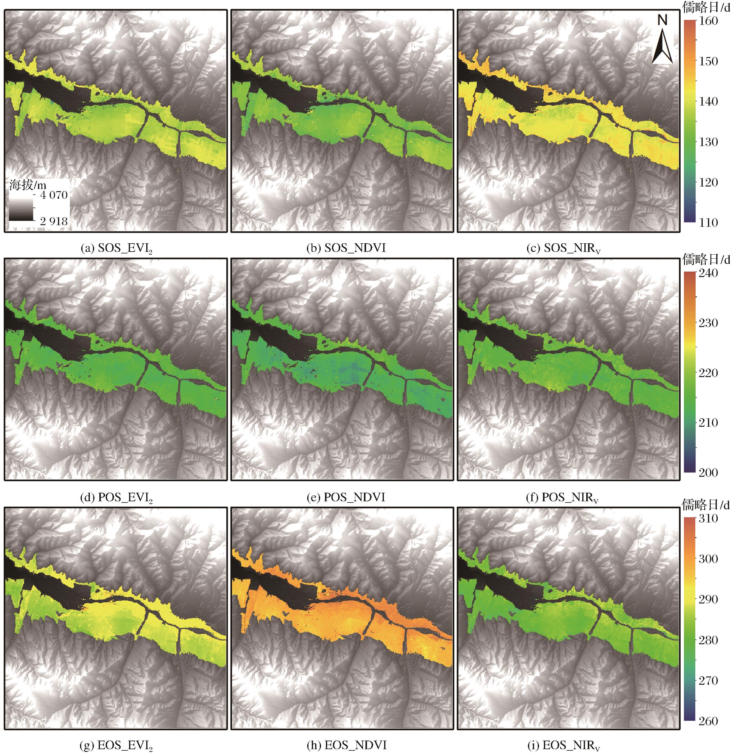 图7 距阿柔超级站 ± 50 m高差范围的试验区内,ESTARFM融合影像的多年平均LSP的空间分布模式 (第1~3行的子图分别代表生长季始期SOS(a~c)、生长季峰期POS(d~f)和生长季末期EOS(g~i);第1~3列的子图分别代表植被指数EVI2(a、d和g)、NDVI(b、e和h)和NIRv(c、f和i) |
