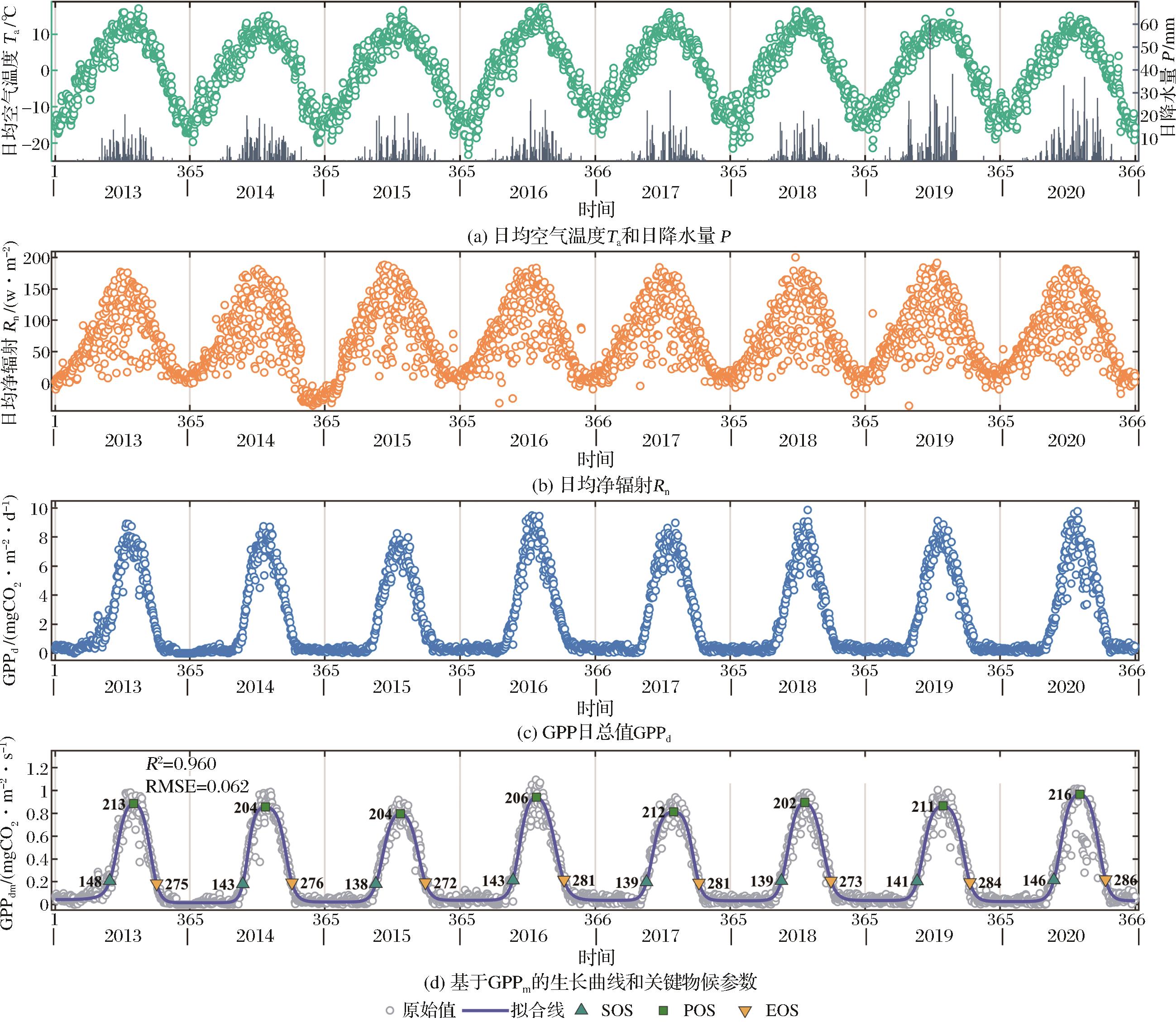 Fig.8 Seasonal dynamics of daily values of environmental factors and GPP, and phenological parameter extraction based on GPPm, from 2013 to 2020 at the A’rou Superstation |