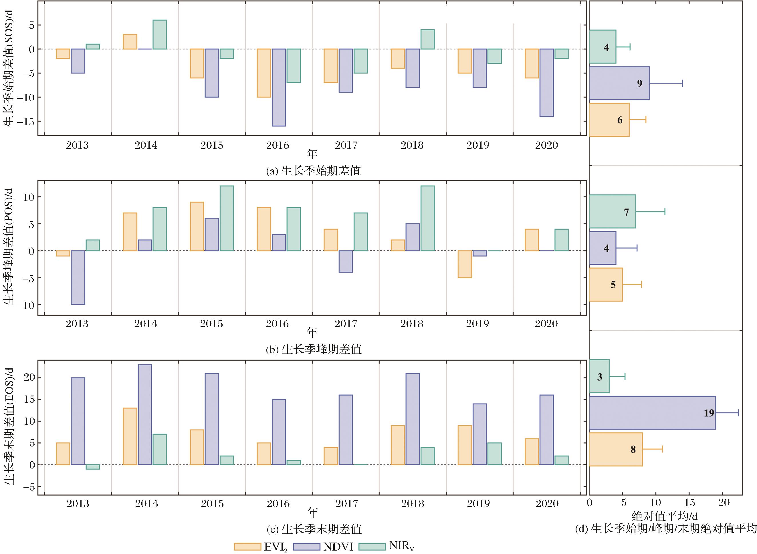 Fig.9 The difference between the SOS, POS, and EOS of the fusion image of EVI2, NDVI, and NIRv in the flux tower source area and flux tower GPPm, as well as the multi-year absolute mean of the SOS, POS, and EOS differences for the three vegetation indices |
