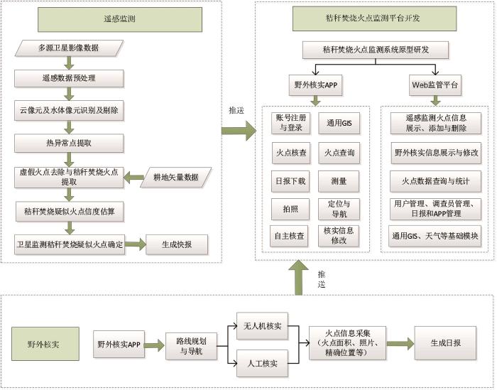 天空地一体化秸秆焚烧监测工作流程为:基于实时下载的多源卫星遥感数据,利用火点提取算法获得火点信息并推送至监测平台,将火点信息以快报等形式实时推送用户,同时野外核查员利用野外核实APP导航至火点处利用无人机进一步核实并采集现场数据,核查数据自动推送至WEB端供用户实时查看,每日定时生成日报将火情信息和核查结果推送至用户。该监管体系可便于用户及时、全面、直观地了解火情动态信息,提升秸秆焚烧监管和信息化水平,总体技术路线如图1 所示。
