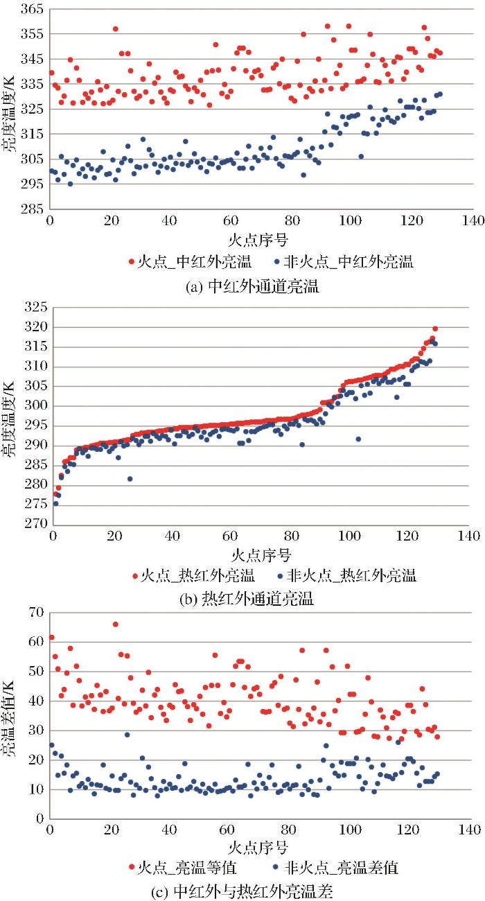 根据维恩位移定律,黑体温度与其辐射峰值波长成反比,即温度越高,辐射峰值对应波长越短。常温地物热辐射峰值位于热红外波段,秸秆焚烧的温度为500~1 000 K,其热辐射峰值波长位于中红外3~5 um之间[13 ] ,即中红外波段对于火点更敏感。选取火点像元及非火点像元各129个,得到火点像元与非火点像元在中红外通道亮温、热红外通道亮温、中红外与热红外通道亮温差值散点图如图2 所示。
