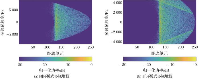 在得到仿真回波信号后,需要对回波信号进行处理。本文使用文献[10 ]、[11 ]总结的基于多视堆栈的延迟校正方法,该方法提取不同Burst指向相同观测区域的子波束构成多视堆栈,不同的子视对应不同的多普勒频率,延迟校正后得到的多视堆栈如图4 所示。图4 (a)表示闭环模式延迟校正后的多视堆栈;对开环模式的多视堆栈,由于方位向欠采样使得部分子波束混入来自其他方向的回波,且混叠回波对应的距离延迟与所在波束的延迟校正不等,经延迟校正后,混叠区域前沿由图2 (c)中的二次弯曲变为式(6)近似的一次函数,如图4 (b)所示。