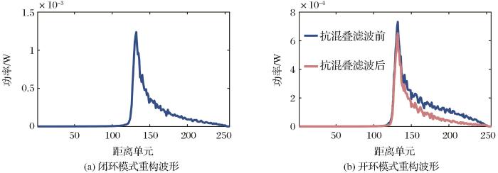 利用式(6)滤除混叠部分后,得到多视堆栈如图5 所示,将两种模式的多视堆栈沿方位向求和,得到延迟校正后的重构回波如图6 所示,其中图6 (b)中,蓝色图线为经抗混叠滤波后得到的重构波形,橙色图线为未进行抗混叠滤波得到的重构波形。从图4 (b)中可以看出,由于混叠部分的回波来自不同波束方向,且混叠回波的前沿无法通过延迟校正对齐至同一距离门,使得多视平均无法有效抑制斑点噪声,导致混叠频率对图6 (b)中的重构回波产生影响影响,波形上升沿和下降沿相对于不包含混叠频率的闭环模式回波产生明显的畸变:波形上升沿起点处和下降沿的功率显著增加,这两处波形变化将直接影响后续最小二乘重跟踪处理对波形半功率点和峰值功率位置的估计结果,进而影响距离估计精度。经抗混叠滤波后,开环模式上升沿起点处的噪声被滤除,而下降沿的下降速率恢复到与闭环模式相近的水平,波形整体恢复到与闭环模式相近的形式,这也使得滤波后的重构波形可以沿用闭环模式的重跟踪方法进行参数提取。