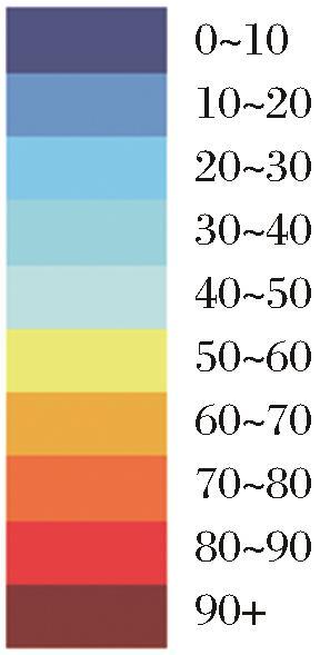 云量预报数据是一种标准数据格式,将经纬度以0.125°划分为1 441×2 880个点,云图的转换仅针对于纬度的变换,首先是通过墨卡托转换公式将预报数据换为WGS84坐标系y,然后找到该坐标下每个点的纬度值lat,进而得知每一点对应的云量预报数值。其中,V是常量,表示地球赤道周长的一半。将坐标系中每一点对应的云量预报数据值显示为该数值段对应的颜色,形成云图,图3 为云图中去量数值对应颜色卡。在获取数据时可优先选取云图中云量小的区域拍摄,从而提高数据获取有效率。