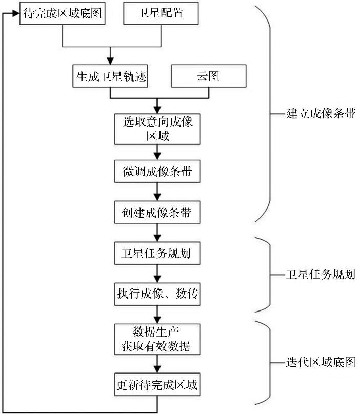 ... 遥感卫星的常规编程摄影需求一般可分为点目标需求和区域覆盖需求,点目标通常范围很小,卫星一次过境便可完成成像任务,而区域覆盖范围通常较大,需要单颗或多颗卫星多次过境拍摄才可以完成全部区域的覆盖[15 -16 ] .“一带一路”数据获取流程主要包括成像条带的建立、卫星任务规划和区域底图的迭代更新.加载区域底图和卫星设置后计算出目标可见窗口,我们采用的卫星轨道预报算法是数值法[17 -18 ] ,经过可视化后生成卫星过境轨迹;将预报云图加载在卫星轨迹和区域底图上并据此创建成像条带;成像条带确认后经过卫星任务规划、成像、数传和数据生产过程获得有效数据;在原区域底图中剔除有效数据的范围得到更新的待完成区域作为下一次数据获取的输入底图,重复过程直至待完成区域被完成,图5 为数据获取的流量. ...