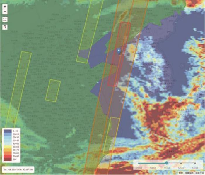 图4 是2021年5月1日某时刻的云量预报云图,在云图上叠加区域矢量后能够清晰看出,数据获取重点为区域底图与云图中云量预报数值较小位置相交的区域,综合云量数值色卡即最优获取区域为图中蓝色和绿色叠加的区域。