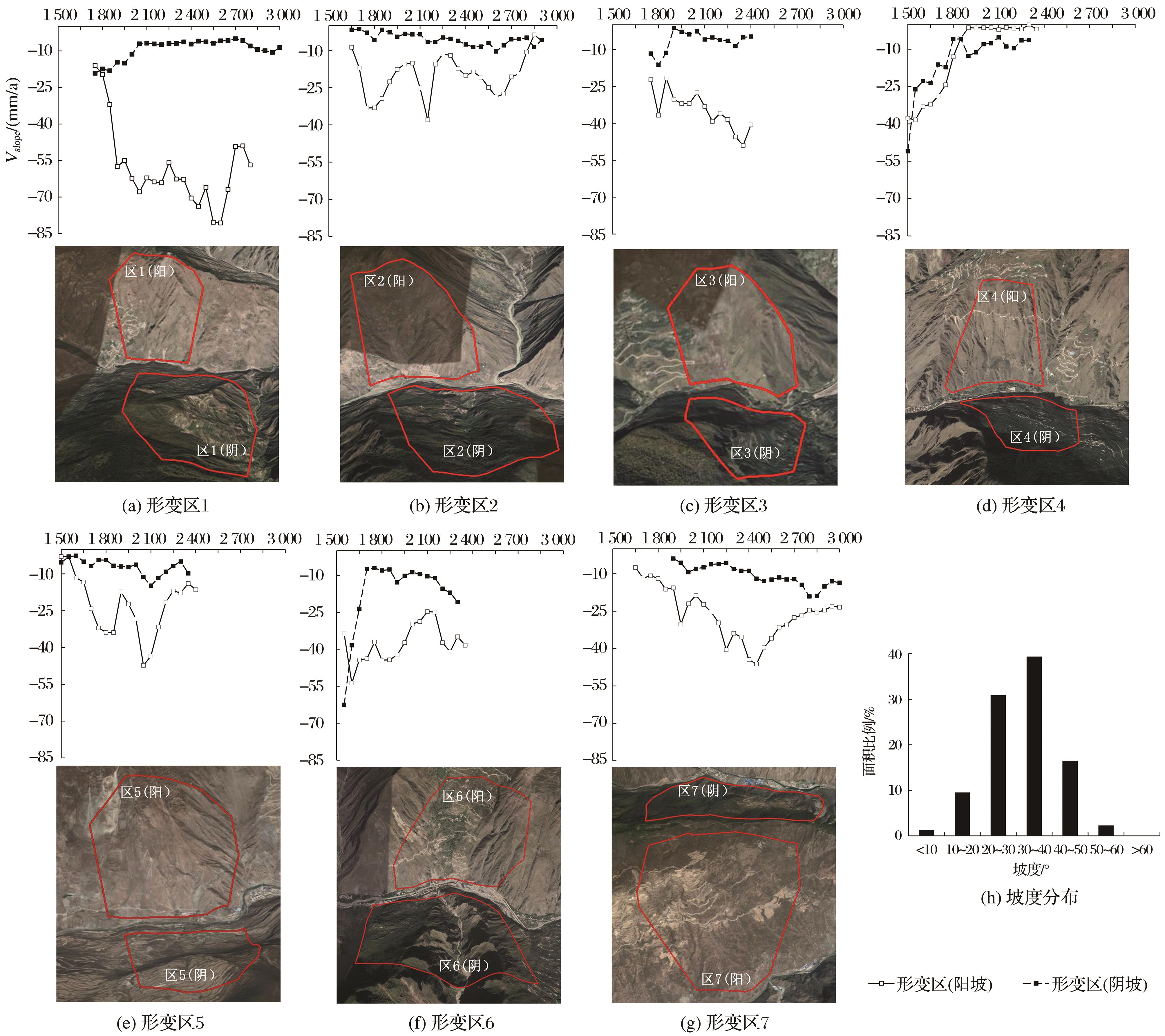 | 图7 典型形变区沉降-高程分布及谷歌影像截图和所有形变点的坡度分布 |