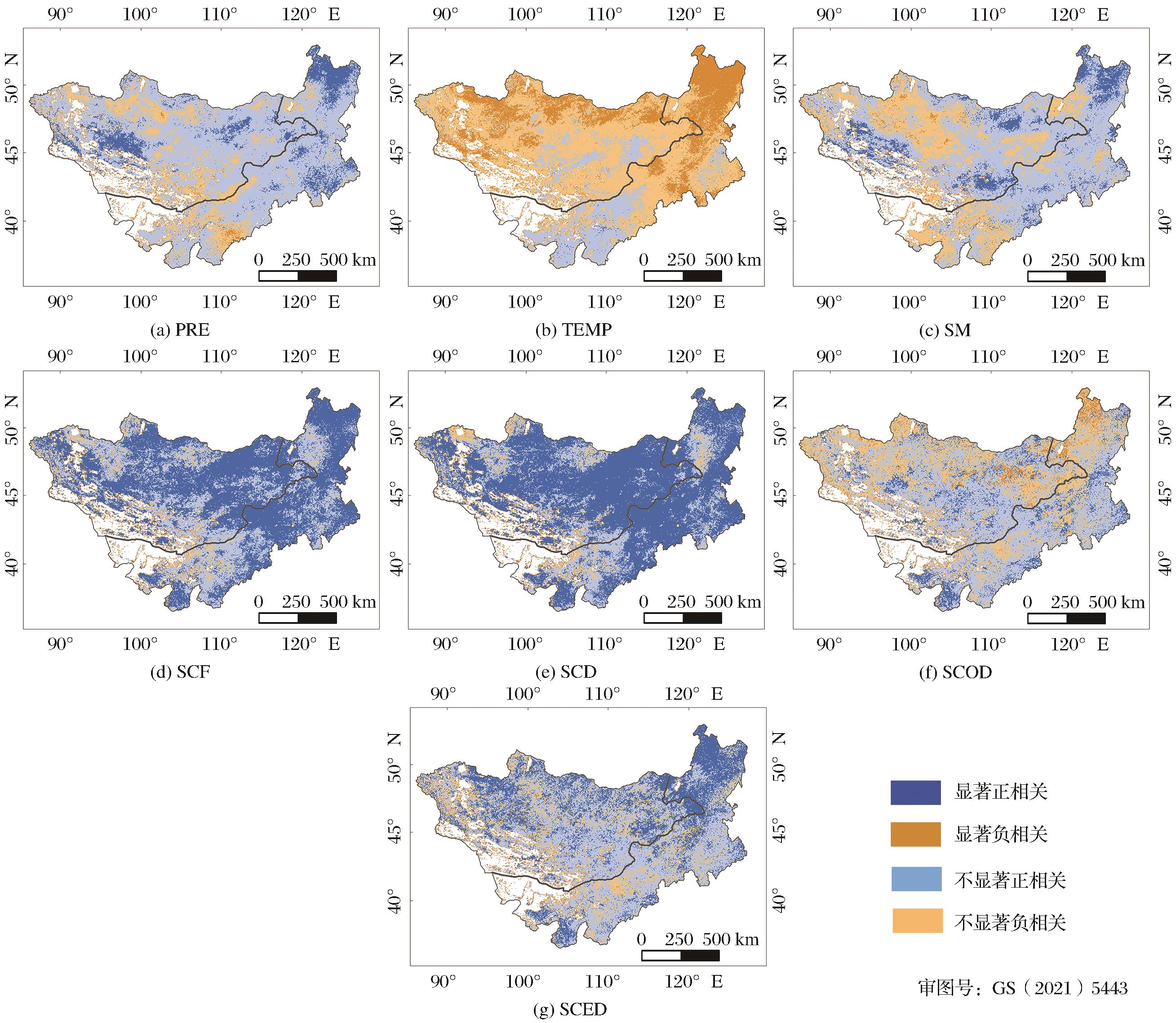 | Fig.6 Spatial distribution of correlation between vegetation reforestation period and climate, snow cover and soil water in Mongolian Plateau from 2001 to 2018 |