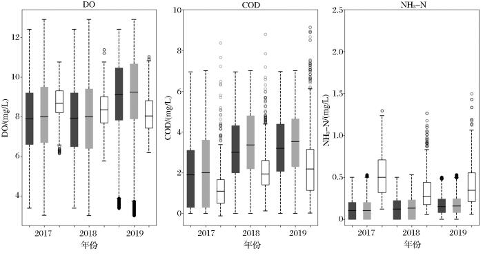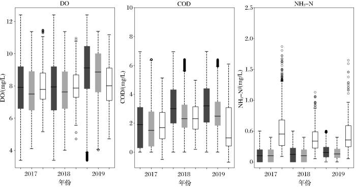 (黑色箱形代表所有站点的地面水质监测数据,灰色箱形代表空间不匹配的水质监测数据,白色箱形代表模型用空间不匹配的多源遥感及气象数据反演出的水质参数;箱形图中,箱体内的实线表示中位数,箱体的下边缘和上边缘分别表示下四分位数(Q1)和上四分位数(Q3),箱形外的上下横线表示最大值和最小值,o表示异常值)