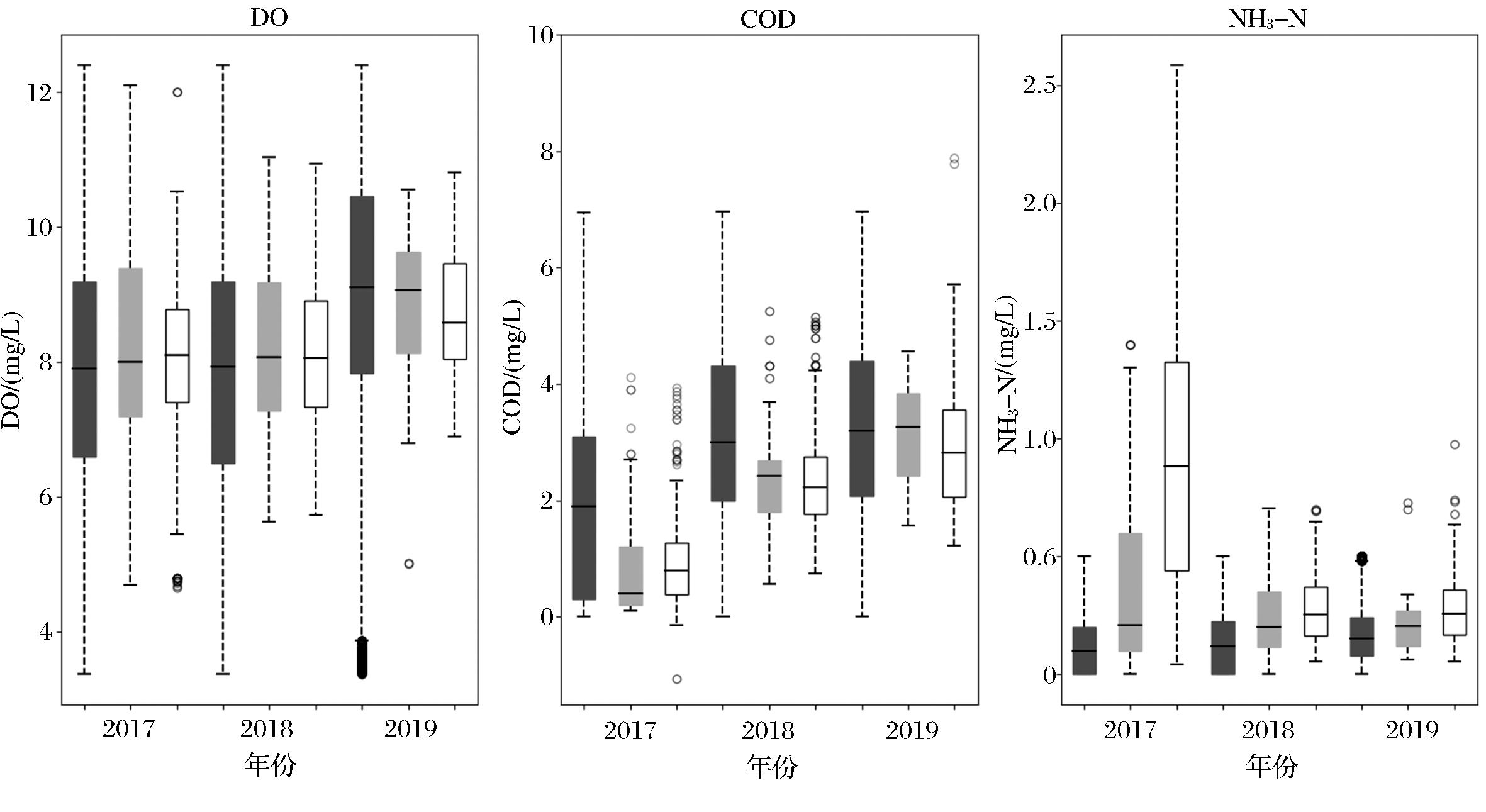| 图4 所有地面水质监测数据,样本中的模型训练数据、模型用样本中测试数据反演的水质参数的年度对比箱形图 (黑色箱形代表所有站点的水质监测数据,灰色箱形代表样本中训练反演模型的水质监测数据;白色箱形代表模型用样本中测试数据反演出的水质参数;箱形图中,箱体内的实线表示中位数,箱体的下边缘和上边缘分别表示下四分位数(Q1)和上四分位数(Q3),箱形外的上下横线表示最大值和最小值,o表示异常值) |
