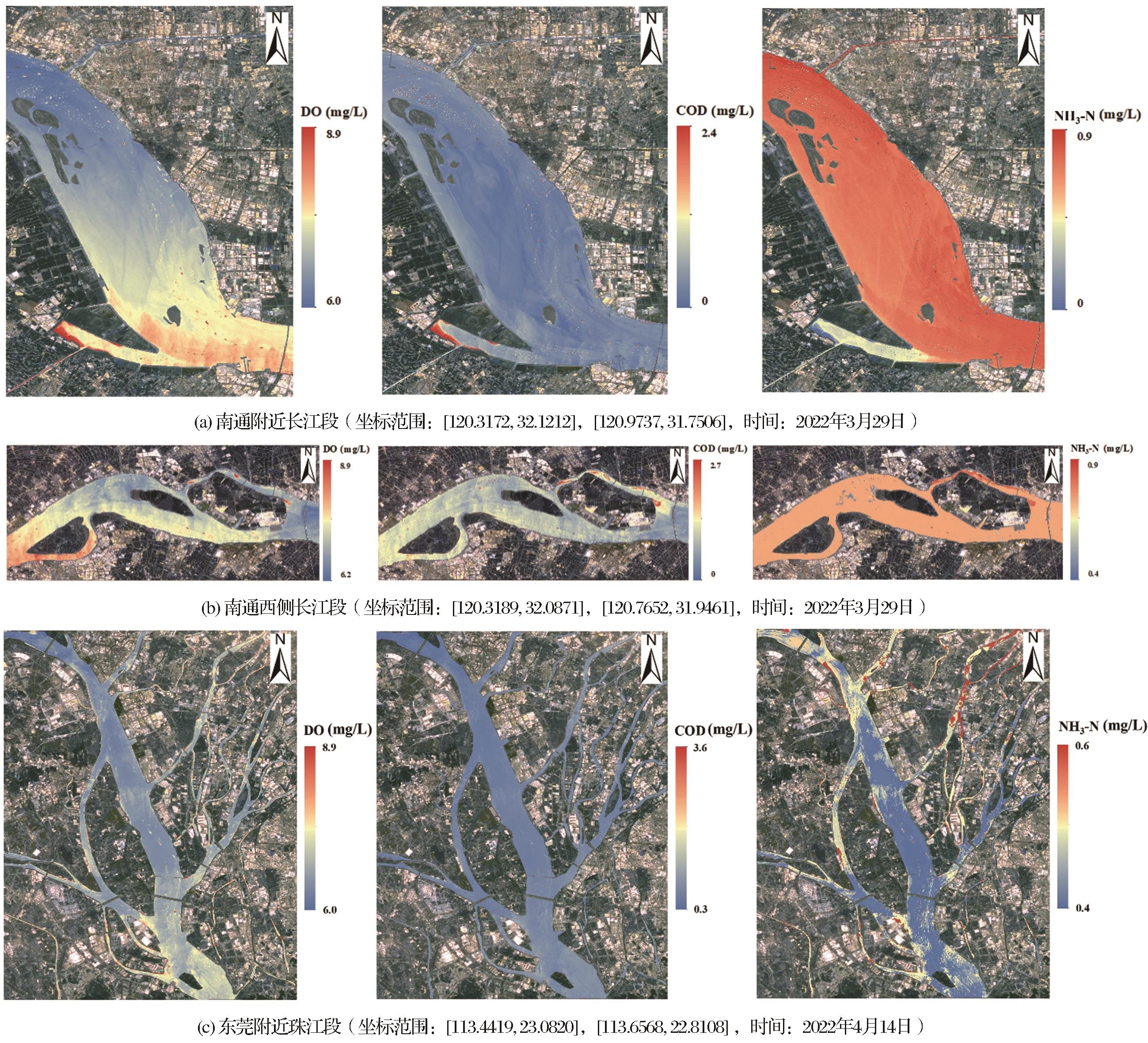 | Fig.7 Spatial distribution of DO, COD and NH3-H water quality parameters in a part of Yangtze and Pearl River retrieved from multi-source remote sensing data |